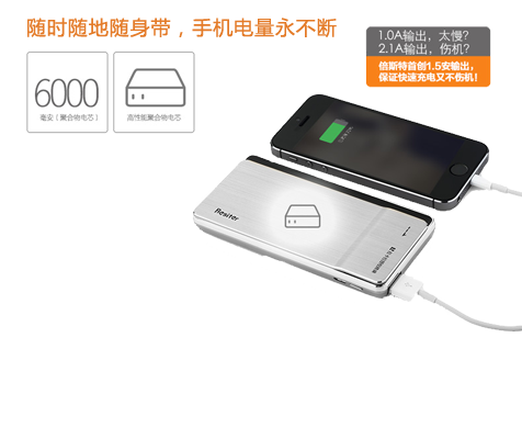 高性能聚合物鋰電芯,鑄就高品質(zhì)移動電源。6000毫安充足容量,隨時隨地為你的手機充電,確保您的信息流永遠(yuǎn)暢通,確保你的精彩人生永不斷電。