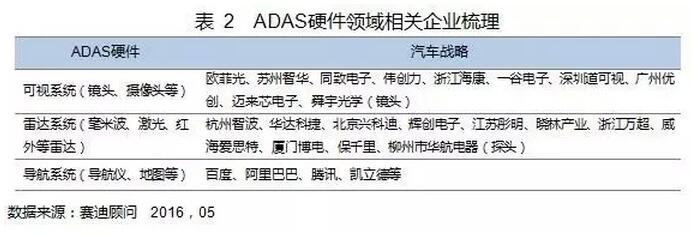 國(guó)內(nèi)ADAS硬件領(lǐng)域已聚集了歐菲光、杭州智波、BAT等數(shù)十家企業(yè)。系統(tǒng)梳理國(guó)內(nèi)攝像頭、雷達(dá)、導(dǎo)航等ADAS智能硬件領(lǐng)域的企業(yè),可視系統(tǒng)中代表性企業(yè)有歐菲光、蘇州智華、同致電子、偉創(chuàng)力等,雷達(dá)系統(tǒng)領(lǐng)域代表性企業(yè)杭州智波、華達(dá)科捷、北京興科迪等,導(dǎo)航系統(tǒng)代表性企業(yè)有BAT、凱立德等。在ADAS算法領(lǐng)域也已有新型企業(yè)成長(zhǎng)起來(lái),比如Minieye、馭勢(shì)科技等,其中Minieye剛完成數(shù)千萬(wàn)元A輪融資,如表2所示。