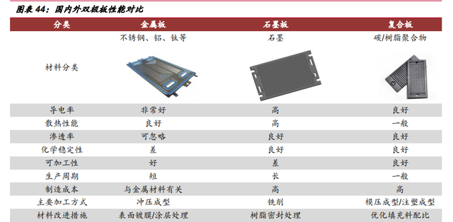 雙極板是燃料電池的陰極板和陽極板,其作用是傳導(dǎo)電子、分配反應(yīng)氣并帶走生 成水。功能上,雙極板材料應(yīng)是電與熱的良導(dǎo)體、具有一 定的強(qiáng)度以及氣體致密性 等;穩(wěn)定性方面要求雙極板在燃料電池酸性(pH=2~3)、電位(E=1.1V)、濕熱(氣 水兩相流,約 80℃)環(huán)境下具有耐腐蝕性且對(duì)燃料電池其他部件不材料的相容無污 染性;商業(yè)化方面要求雙極板材料要易于加工、成本低。燃料電池常采用的雙極板材 料包括石墨碳板、復(fù)合雙極板、金屬雙極板三大類,由于車輛空間限制(尤其是乘用 車),要求燃料電池具有較高的功率密度。因此相對(duì)較薄的金屬雙極板有更好的應(yīng)用 前景。