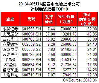 表2 2013年05月A股宣布定增上市公司計劃融資規模TOP10