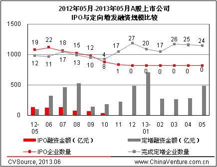 圖2 2012年05月-2013年05月A股上市公司IPO與定向增發融資規模比較