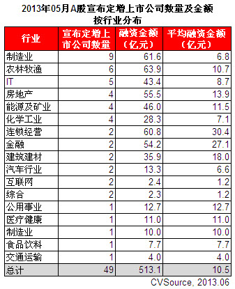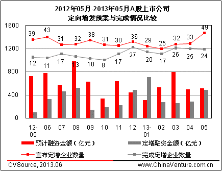 2013年5月,有24家A股上市公司實施了定向增發方案,環比下降 4%;融資金額總計485.2億元,環比增加71%。與此同時,有49家A股上市公司宣布了定向增發預案,環比增加48%;預計融資金額總計513.1億元,環比增加3%。