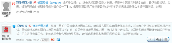 長榮股份表示,目前公司紙電池項目在藥貼、眼貼等方面的應用開發(fā)基本完成,并向客戶提供紙電池樣品進行測試。