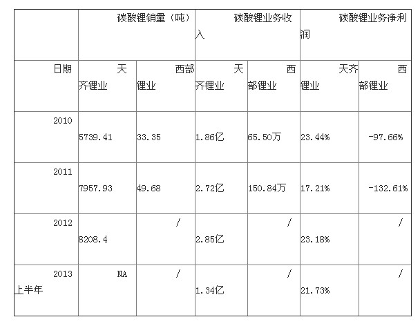 備注:2012-2013年上半年,江西鋰業正致力于進行年采選 40 萬噸鋰輝石擴產、年產5000 噸碳酸鋰生產線的技改項目建設等,碳酸鋰相關業務基本處于停產狀態。