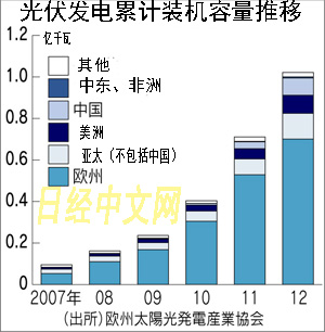 2012年新裝機容量為3110萬千瓦。雖然同比增長率僅為2%,但持續保持較高水平。中國由于政府的鼓勵舉措等原因,新裝機容量達到500萬千瓦,增至2倍,凈增加容量僅次于德國,躍居全球第2位。而美國增長8成,日本增長5成。在一直拉動市場增長的歐洲,由于鼓勵政策被取消,新裝機容量減少2成以上。