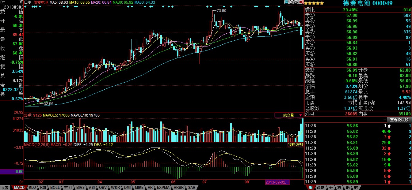 中國(guó)電池雜志-中國(guó)電池網(wǎng)9月11日訊(肖何 北京報(bào)道 ) 受綜合利空消息影響,德賽電池(000049)11日早盤一路狂瀉到跌停,午盤收在56.89元,下挫9.68%。按照流通股本1.3679億股計(jì)算,9月9日-11日上