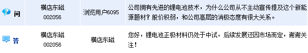 橫店東磁(002056)周四在全景網互動平臺上表示,公司鋰電池正極材料仍處于中試,后續發展還因市場而定。