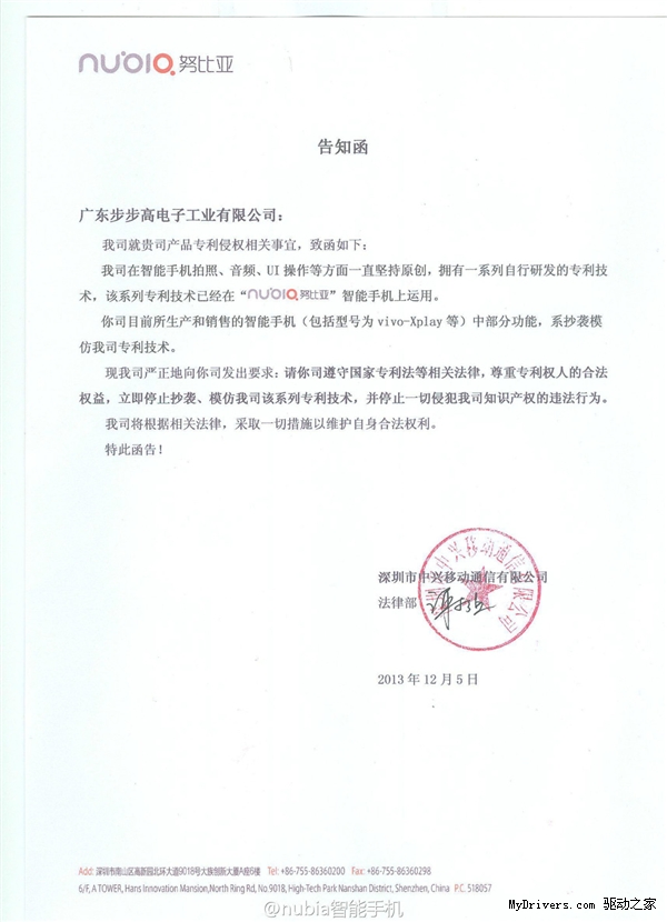 中興移動通信有限公司旗下nubia智能手機剛剛通過官方微博發布“告知函”,指責步步高旗下vivo智能手機(包括vivo Xplay等型號)抄襲模仿nubia專利技術,并要求步步高立即停止侵犯nubia知識產權