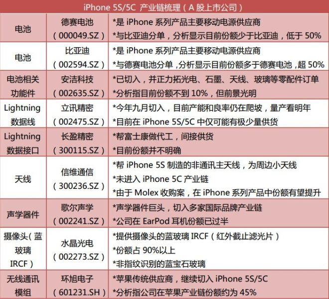 以iPhone 5S/5C為例。北京時間9月11日凌晨一點,蘋果公司向全球發布其了最新款手機iPhone 5S及iPhone 5C。而根據本社整理,有多家A股上市公司切入了蘋果產業鏈,如下圖所示:
