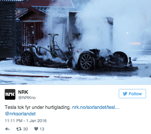 據外媒 F.drelandsvennen 的報道,周五早上一輛特斯拉 Model S 在超級充電站充電時突然起火。所幸事故發生后沒有人員傷亡。