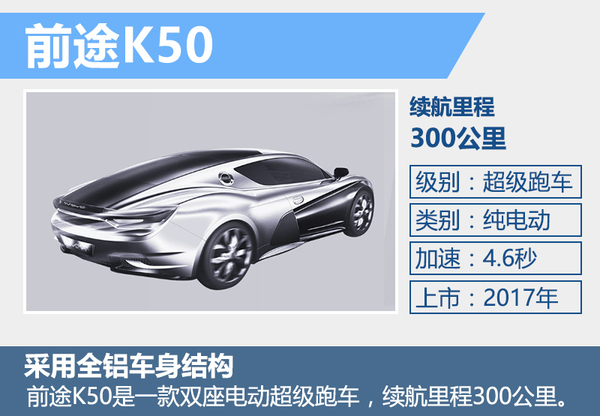 前途K50作為一款雙座超級純電動跑車,百公里加速4.6秒。續航里程300公里。車身采用全鋁合金框架式結構,極大程度的降低了車身重量。其80%的車身框架均采用高強度擠壓鋁合金型材工藝保證了產品的制造精度,同時降低了產品制造成本。此外,通過創新的模塊化電池箱設計,使車輛具備充電、換電兩種使用模式的切換功能。