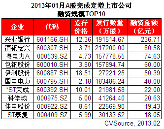表1 2013年01月A股完成定增上市公司融資規(guī)模TOP10