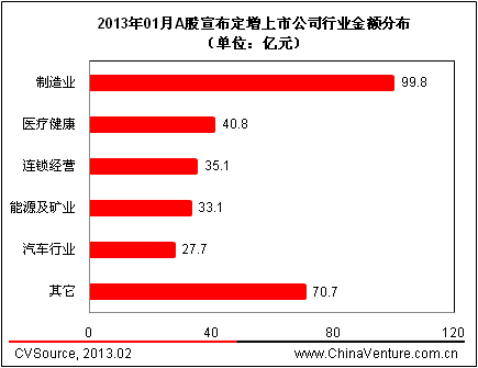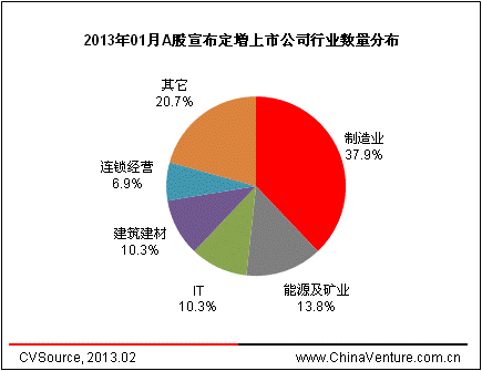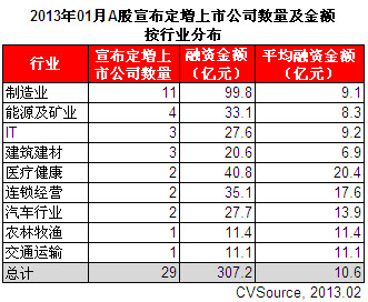 表5 2013年01月A股宣布定增上市公司數(shù)量及金額按行業(yè)分布