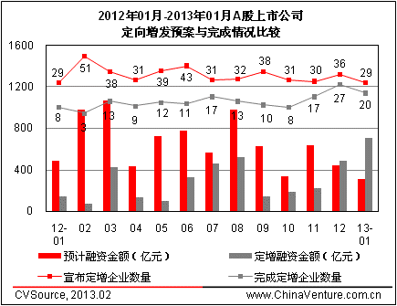 圖1 2012年01月-2013年01月A股上市公司定向增發(fā)預(yù)案與完成情況比較