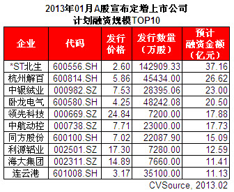 表2 2013年01月A股宣布定增上市公司計(jì)劃融資規(guī)模TOP10