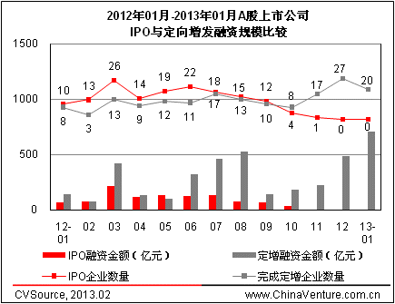 圖2 2012年01月-2013年01月A股上市公司IPO與定向增發(fā)融資規(guī)模比較