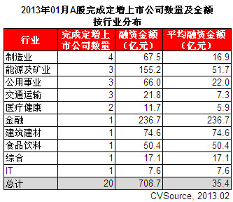 表4 2013年01月A股完成定增上市公司數(shù)量及金額按行業(yè)分布