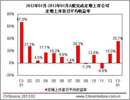 定向增發(fā)收益方面,根據(jù)ChinaVenture 投中集團(tuán)統(tǒng)計(jì)顯示,2013年1月完成定增的20家上市公司定增上市首日平均收益率*為35.7%,較上月有所回升(見圖3、表3)。