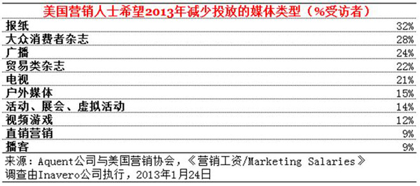 傳統大眾媒體曾讓營銷者在接觸受眾方面受益匪淺,但現在,受眾的碎片化與小規?;约跋鄬Ω量痰脑u估標準使得營銷者將重點轉向數字媒體。平面媒體的利益損失最大:根據2012年10-12月的一份調查,30%的受訪者希望所在企業在2013年減少對報紙和消費類雜志的投放;此外,超過20%的受訪者甚至希望減少電視類投放。