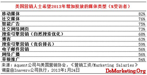 在數字媒體方面,移動媒體與社交媒體是2013年預期增長最多的兩個領域。80%多的受訪者將移動媒體作為增加投放的重點,同時超過四分之三的受訪者將社交媒體作為重點。營銷者對競價排名(59%)和電子郵件營銷(56%)的青睞度要稍低,盡管他們仍表示會更多地關注這兩個渠道。