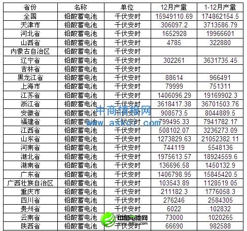 2012年1-12月中國鉛酸蓄電池產(chǎn)量為174862154.5千伏安時。