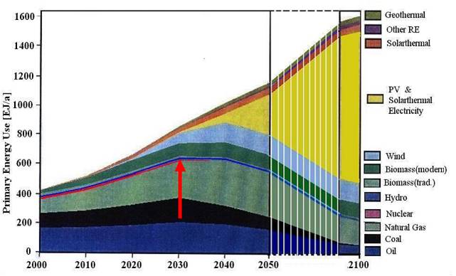 到了 2011、 2012年, 一切都變了。 此時, 世界石油勘探技術再次獲得突破,石油儲量“猛增”,加拿大油砂、墨西哥灣的鹽下石油找到了先進的開采技術,深海鉆探技術每天都有新的突破,困擾美國多年的頁巖氣開采技術也取得了巨大突破……正如前幾次“能源危機”如期解除一樣,石油“枯竭”的擔憂再次煙消云散,第五次“能源危機”隨之解除。就在前兩年被新能源人士津津樂道的世界能源署 2000年繪制的這張未來能源格局預測圖現在看起來就像一個拙劣的笑話。這些,才是 2011年太陽能產業步入嚴冬的真正推手。