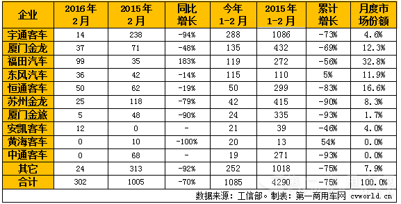 先看看新能源:今年2月份,國內純電動客車產量只有975輛,環比下降54%,同比上升62%;這個同比增幅,比1月份的97%減少35個百分點,年初至今的月度增幅不斷放緩。2月份,國內混合動力客車產量只有485輛,環比下降42%,同比下降28%;2月份的糟糕表現,也讓1-2月的混合動力客車累計產量降至1492輛,同比下滑12%。