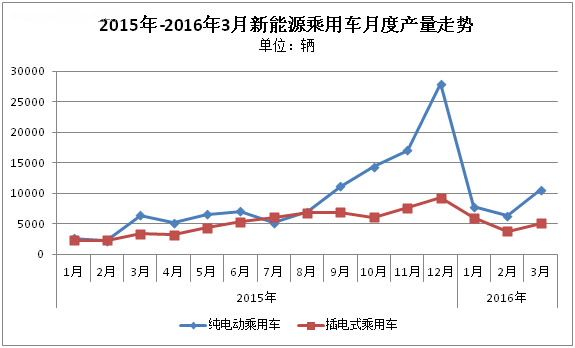 2016年新能源乘用車銷量受開年淡季的影響,經過前兩月的連續下滑,在3月開始出現上漲趨勢。據乘聯會數據統計,2016年3月新能源乘用車銷量達1.56萬輛,環比增長55%,與去年同期相比增長60%。截至目前,第一季度累計銷量已達3.95萬輛,同比增長超過1倍,實現月均1.3萬輛左右的銷量水平。