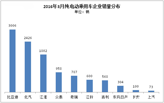 分車企看, 10家純電動乘用車企業排行中,比亞迪以3006輛的水平居于首位,而北汽則由2月排名首位滑至本月第2名,而江淮繼續維持第三名的地位。值得指出的是,雖然排名有所改變,但總體看,細分到3月各家車企銷量都有不同程度的提升。其中,3月銷量過千輛的車企依舊是前三名,比亞迪、北汽、江淮三家企業累計銷量達7234輛,占純電動乘用車總銷量的69%。而銷量過百輛的企業也達9家,較之2月有大幅提升。