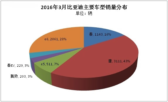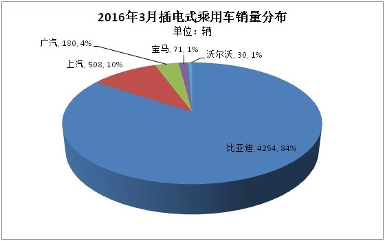 細分看,3月銷量增長幅度最大的當數比亞迪,由2月1217輛的水平攀升至3月3000多輛的水平,環比增幅達1.5倍。其中比亞迪純電動乘用車車型逐步豐富,新推出的比亞迪秦EV3月銷量也達229輛,此外,比亞迪e6、e5、騰勢銷量都有提升,e6也由2月1105輛的銷量提升至3月2061輛的水平。總體看,純電動乘用車銷售比例在比亞迪企業內部逐步加大,與插電式混合動力乘用車比例基本持平,各占50%。