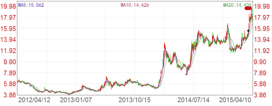 持續(xù)穩(wěn)定增長的業(yè)績也讓萬向錢潮受到二級市場的追捧。公司股價從2012年底探至2.93元的低位后,便一路震蕩向上,2015年4月7日盤中更是創(chuàng)下19.98元的歷史新高。短短4年股價漲幅近10倍。