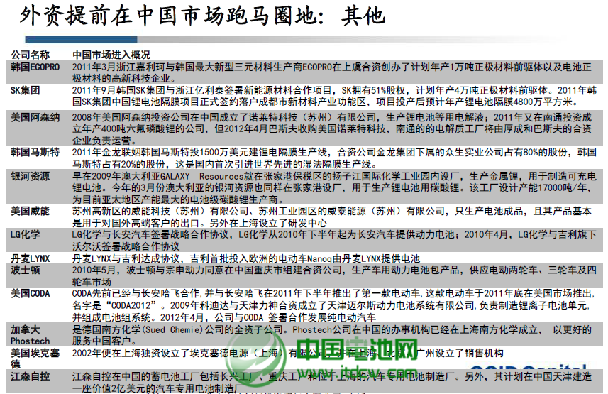 2011年9月韓國SK集團與浙江億利泰簽署新能源材料合作項目,SK擁有51%股權(quán),計劃年產(chǎn)4萬噸正極材料前驅(qū)體。2011年韓國SK集團中國鋰電池隔膜項目正式簽約落戶成都市新材料產(chǎn)業(yè)功能區(qū),項目投產(chǎn)后預計年產(chǎn)鋰電池隔膜4800萬平方米。