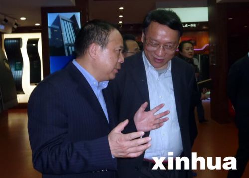 武漢市人民政府市長萬勇(左)向新華社高級記者方政軍博士介紹項目合作情況。陳敢 攝