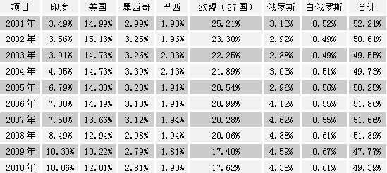 2001年-2010年有關國家或地區(qū)石墨電極需求全球市場比例
