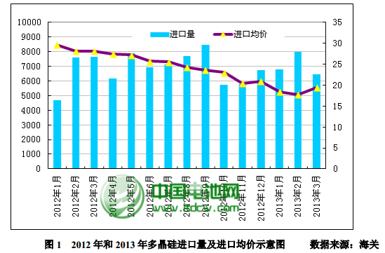 據最新海關統計數據顯示,2013 年 3 月我國多晶硅進口量為6433 噸,環比下滑 19.49%,同比大幅下滑 15.93%;進口單價方面,3 月份多晶硅進口均價較 2 月有所反彈,亦是 2013 年以來首次回升,為 19.39 美元/千克,環比增長 9.55%,同比下降 31%,較 2012 年全年均價下滑 23.5%。