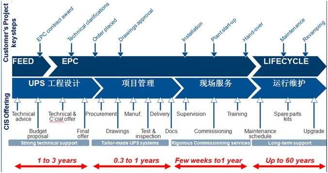 工業(yè)UPS按工業(yè)現(xiàn)場的多樣化需求和惡劣環(huán)境設(shè)計(jì)制造,在充分滿足客戶需求的過程中,體現(xiàn)了項(xiàng)目管理的運(yùn)用。所以在這里我們對工業(yè)UPS的理解應(yīng)不僅停留在產(chǎn)品層面,它實(shí)際上是在對客戶需求充分理解的基礎(chǔ)上,為客戶提供整體的電源保護(hù)解決方案(見圖4),并把此方案作為一個(gè)工程項(xiàng)目,與客戶充分合作一同進(jìn)行項(xiàng)目工程設(shè)計(jì)、項(xiàng)目管理、現(xiàn)場服務(wù)和運(yùn)行維護(hù)的動態(tài)過程(見圖5)。從一定意義上看,可以把工業(yè)UPS供應(yīng)商理解為一個(gè)工程公司。