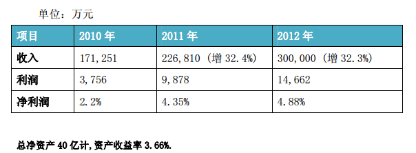 截至 2012 年,標的企業總資產約 63 億元, 凈資產約 40 億元。2012 年完成收入 30 億元。實現利潤 14600 余萬元。