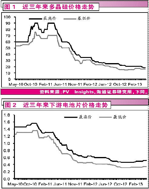 從行業(yè)復(fù)蘇的邏輯上看,最沒有技術(shù)含量的晶硅制造企業(yè)依然受到原料進(jìn)口和價格的雙重壓力,業(yè)績復(fù)蘇或許會晚一些,但利潤與股價波動的周期性特征卻會比較顯著。而2013年國內(nèi)光伏需求的爆發(fā),最直接受益的則是下游公司,因為下游企業(yè)更受益于國內(nèi)市場需求的回升以及受“雙反”制裁影響較小,比如做國內(nèi)光伏項目的EPC總包商特變電工,以及占國內(nèi)逆變器30%份額的陽光電源,電站開發(fā)商海潤光伏、航天機電、中利科技等。其后依次才是組件、電池片、硅片、多晶硅等中上游公司,而以曾經(jīng)的大牛股精功科技為代表的光伏設(shè)備股則受益較小,因為行業(yè)擴產(chǎn)高峰已過,剛剛喘過來氣的光伏企業(yè)不會立即上馬新生產(chǎn)線,這點從光伏設(shè)備股走勢較弱也可以看出端倪。