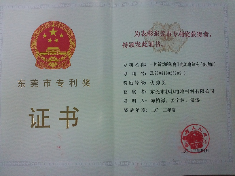 東莞市杉杉電池材料有限公司于2008年將自主研發(fā)技術(shù)產(chǎn)品“一種新型的鋰離子電池電解液” 申請國家發(fā)明專利,并于2010年獲得國家專利授權(quán),專利授權(quán)號為:ZL 200810026705.5,該專利技術(shù)的實施及產(chǎn)業(yè)化,為杉杉電解液帶來巨大的經(jīng)濟效益及社會效益。 據(jù)悉,該專利獲得2012年東莞市專利優(yōu)秀獎稱號。