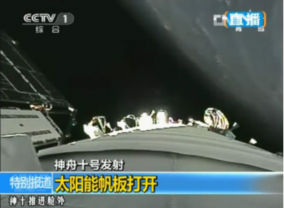 神舟十號飛船進入預定軌道,太陽能帆板展開。