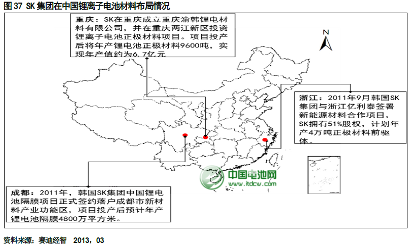 在中國電池材料的區(qū)域布局上,SK 集團看中了成都和重慶地處西部所帶來的產(chǎn)業(yè)轉(zhuǎn)移機會,并充分利用中央在中西部的優(yōu)惠政策,將其隔膜和正極材料項目分別投資在成都和重慶,分享中國政策紅利。另外,在投資思路上,SK 在投資正極材料和隔膜的基礎上,以產(chǎn)業(yè)鏈的思維向上延伸到正極材料前驅(qū)體,通過收購的方式獲取了浙江億利泰51%的股權。SK 集團在中國以產(chǎn)業(yè)鏈的思維整合中國電池材料產(chǎn)業(yè),未來,SK 將繼續(xù)在動力電池材料產(chǎn)業(yè)鏈領域展開中國國內(nèi)投資與布局。