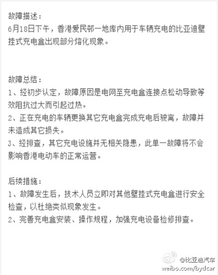 據(jù)香港《蘋果日報》6月18日報道,比亞迪電動的士E6在進入香港出租車市場僅一個月之后,即發(fā)生充電時爆炸事故。今天(6月20日)比亞迪官方發(fā)表官方聲明解釋此事件稱:故障原因是電網(wǎng)至充電盒連接點松動導(dǎo)致等效阻抗過大而引起過熱,其它充電器并不存在此故障,此單一故障不會影響香港電動車的正常運營。