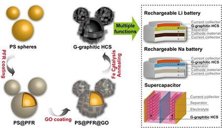圖2. 仿生模板法設計合成石墨烯包覆中空樹脂熱解碳球。