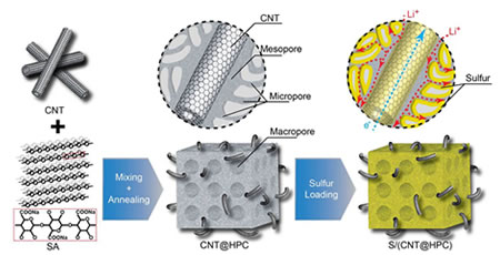 圖3. 多壁碳納米管(CNT)內嵌到HPC中形成導電網絡,將硫引入制備出硫-碳復合正極材料S/(CNT@HPC)傳輸通道。