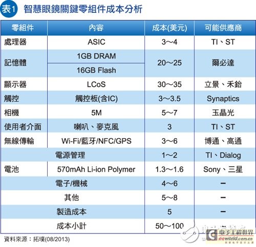 針對(duì)各項(xiàng)智能眼鏡關(guān)鍵零組件成本落點(diǎn)(表1),據(jù)分析,整合近距離無(wú)線通信(NFC)、藍(lán)牙(Bluetooth)、無(wú)線區(qū)域網(wǎng)絡(luò)(Wi-Fi)和調(diào)頻(FM)的四合一無(wú)線傳輸模塊,可望以3-6美元的價(jià)格及低占位體積優(yōu)勢(shì)獲得原始設(shè)備制造廠(OEM)青睞;至于處理器部分,廠商將傾向采用專用集成電路(ASIC),可能供應(yīng)商為德州儀器(TI)及意法半導(dǎo)體(ST),每顆芯片成本約3-4美元;此外,廠商將采用同樣具低成本優(yōu)勢(shì)的硅基液晶 (LCoS)方案做為顯示面板,成本約30~35美元,可能供應(yīng)商為臺(tái)商立景及禾鈶。總體而言,若供應(yīng)鏈廠商可控制各項(xiàng)零組件成本于理想價(jià)格區(qū)間,則智能眼鏡成本將僅50~100美元,仍可為品牌廠帶來(lái)可觀獲利。
