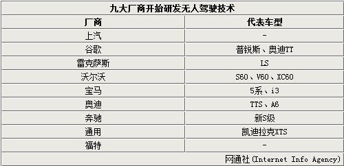 自動駕駛技術(shù)正吸引著各大車企著力研究,其中不乏著名車企奔馳、寶馬、奧迪、沃爾沃、雷克薩斯等。這些車企早已開始研究,并且研發(fā)進(jìn)程十分迅速,不少車型已接近量產(chǎn)。沃爾沃對自動駕駛的研發(fā)始終未停止過,目前仍處于基礎(chǔ)系統(tǒng)與配套設(shè)施的層次,根據(jù)沃爾沃的計劃未來旗下全系車型均將搭載“自動駕駛系統(tǒng)”;而奧迪是繼谷歌之后第二家在美國內(nèi)華達(dá)州獲得自動駕駛車型測試許可證的廠商,也是第一家獲此許可的汽車制造商;奔馳在研發(fā)自動駕駛汽車方面一直處于獨立的研究,在今年上市的奔馳全新S級轎車就已經(jīng)搭載了其最新的“自動駕駛系統(tǒng)”。