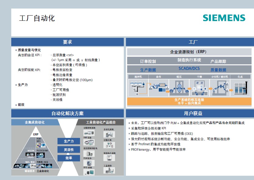 西門子可通過橫跨此領域完整價值鏈的全面解決方案產品線,來促進高效大規模的電池生產。從自動化與驅動技術,直至生產規劃和設計軟件,我們可以幫助客戶對電池生產過程中的每一工序進行優化。