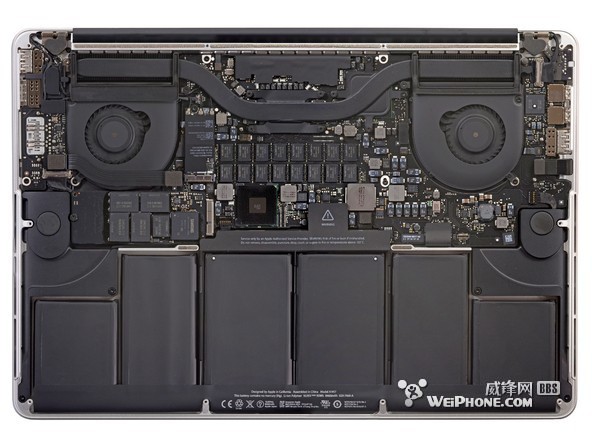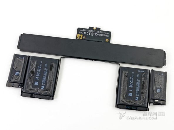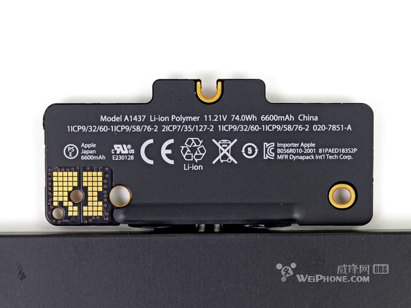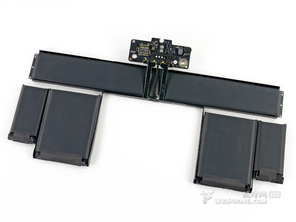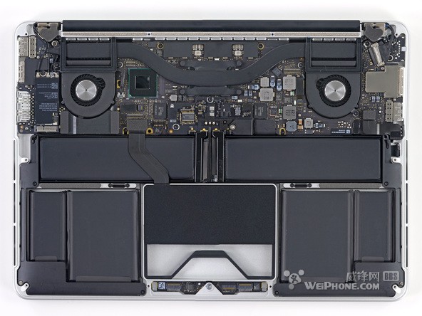 整塊電池一共由 6 個電池單元組成,整體看上去就像一個衣架。和 15 英寸 Retina Macbook Pro 的電池設計相比,“衣架”風格的設計為 13 英寸 Retina Macbook Pro 的內部節省了許多空間。