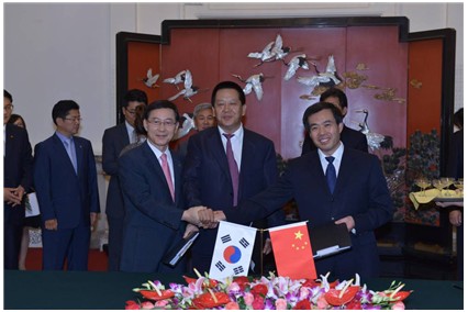 SK集團中國市場發力 接連簽署石化和車用電池項目-北汽集團、北京電控公司、SK集團簽字儀式