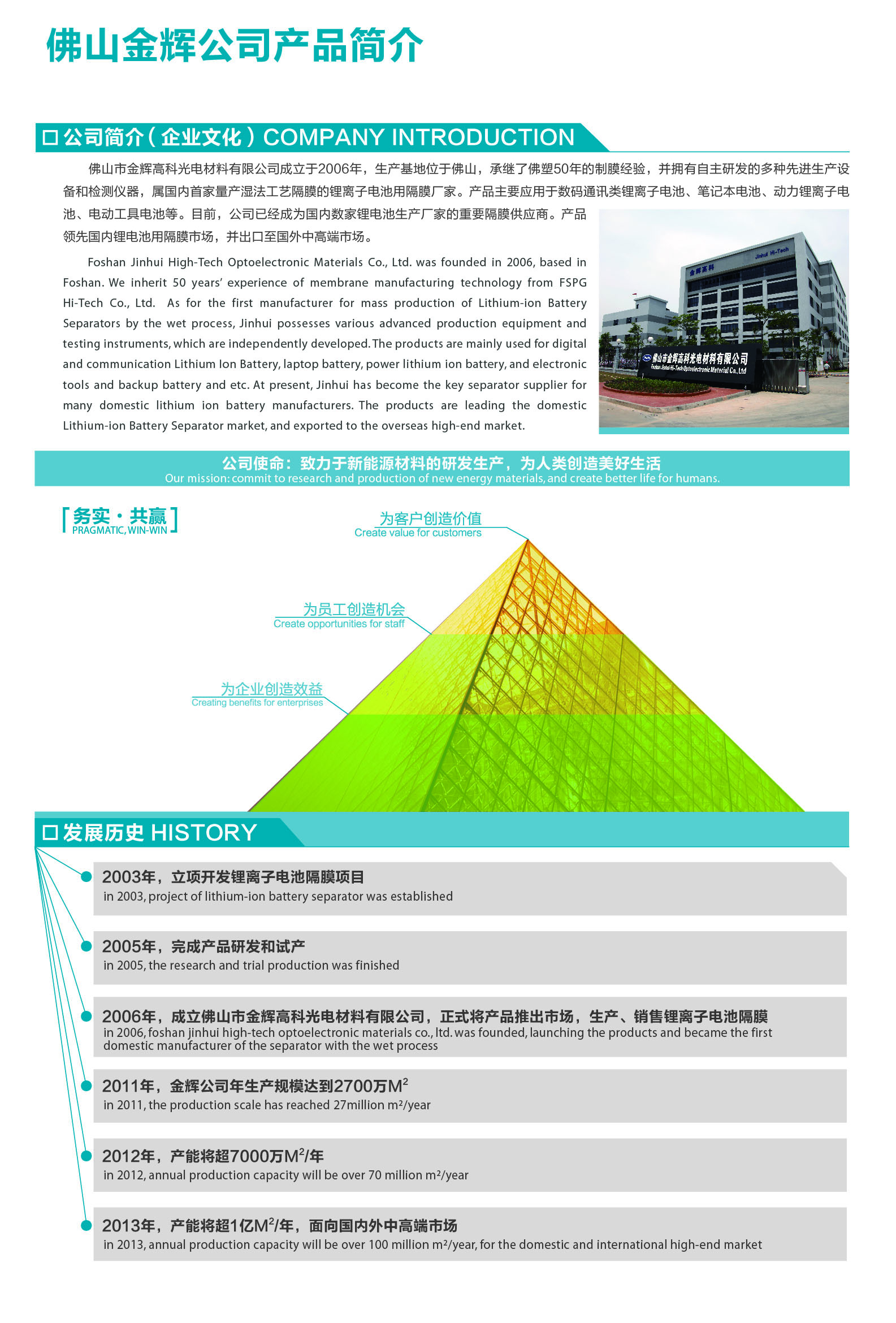 佛山市金輝高科光電材料有限公司(簡稱金輝公司)成立于2006年,目前注冊資本為921萬美元,是國內(nèi)第一家使用濕法工藝生產(chǎn)鋰離子電池隔膜的廠家,國家火炬計劃重點(diǎn)高新技術(shù)企業(yè),廣東省創(chuàng)新型企業(yè)試點(diǎn)單位。我司研制生產(chǎn)的鋰離子電池隔膜以質(zhì)量穩(wěn)定、性價比高等優(yōu)勢蜚聲國內(nèi)外市場,打破了長久以來國外產(chǎn)品的壟斷,填補(bǔ)了國內(nèi)空白,工藝技術(shù)居國內(nèi)領(lǐng)先地位,產(chǎn)品質(zhì)量達(dá)到國際同類產(chǎn)品先進(jìn)水平。